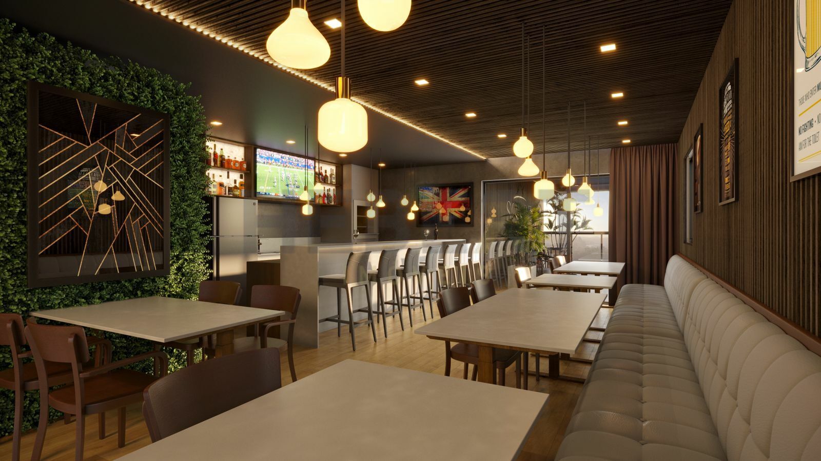 ➖ Rooftop com pub inglês e mirante;